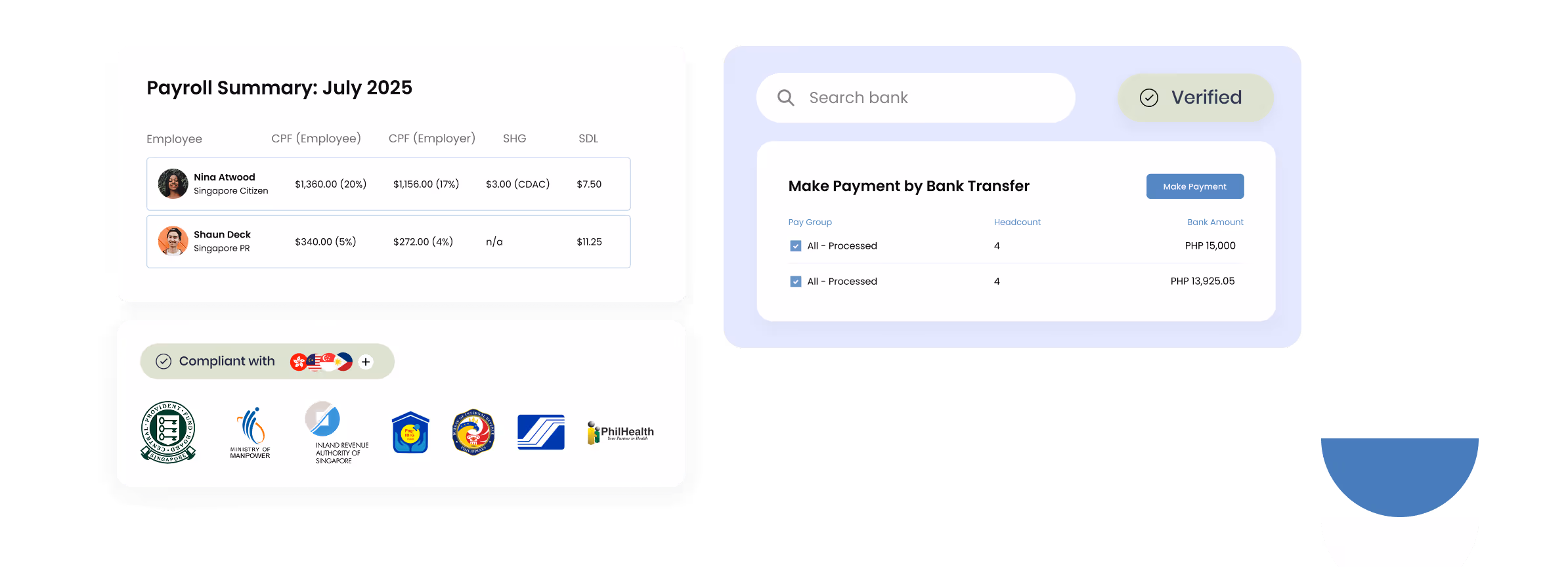 Full HR & Payroll coverage for Philippines, Singapore, Malaysia, Hong Kong, and Indonesia. Each market has local support teams and built-in compliance features.
